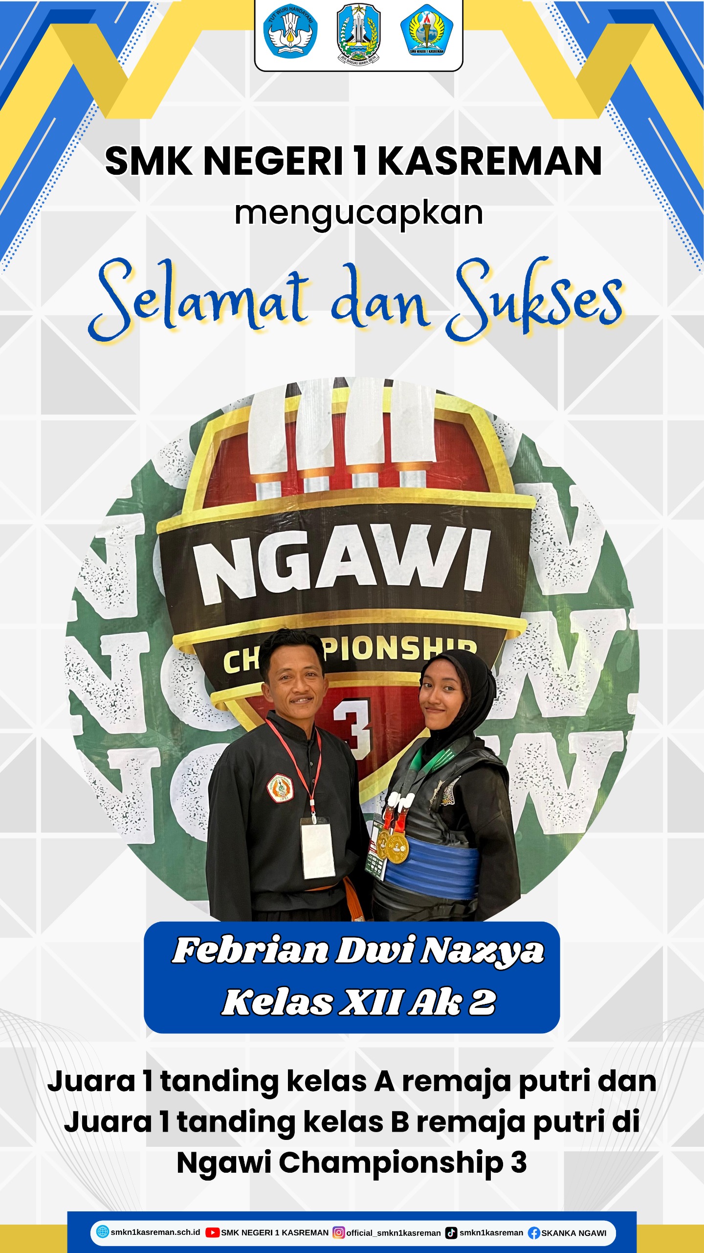 Selamat kepada Febrian Dwi Nazya kelas XII Akuntansi 2, yang telah meraih juara 1 tanding kelas A remaja putri dan Juara 1 tanding kelas B remaja putri di acara Ngawi Championship 3 yang dilaksanakan pada tanggal 18-20 Juli 2025.