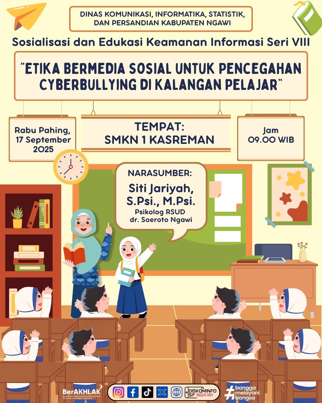 Bertempat di Aula SMK Negeri 1 Kasreman Ngawi, pada hari Selasa (17/09/2025) Dinas Komunikasi, Informatika, Statistik, dan Persandian Kabupaten Ngawi menyelenggarakan Sosialisasi dan Edukasi Keamanan Informasi dengan tema “Etika Bermedia Sosial untuk Pencegahan Cyberbullying bagi Pelajar Kabupaten Ngawi”. Narasumber dalam kegiatan yang diikuti oleh ratusan pelajar SMAN 1 Ngawi tersebut adalah Siti Jariyah, psikolog klinis pada RSUD dr. Soeroto Kabupaten Ngawi.